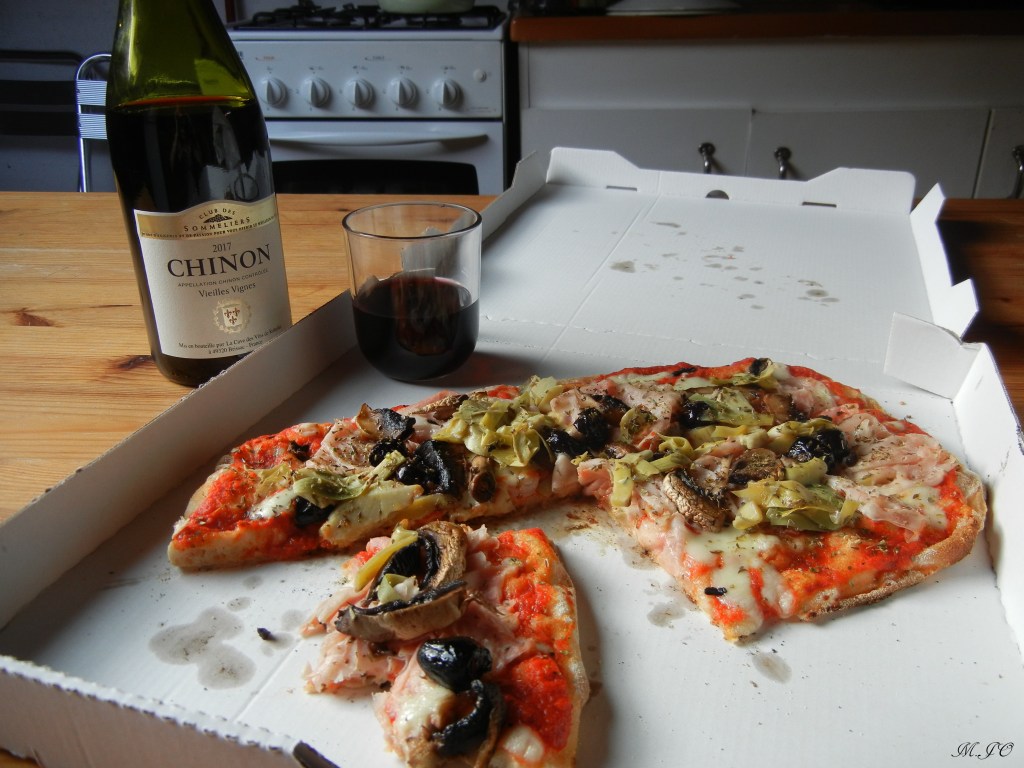 J’accompagne ma pizza d’un Chinon 2017, qui vient de la région viticole de la vallée de la Loire, le cépage est un mélange de cabernet franc et le cabernet sauvignon qui était vraiment excellent surtout à 3 euro!! Il faut dire que les vins en France ne sont pas très cher, c’est sûr qu’on peut trouver des bouteilles dispendieuses, mais généralement, c’est super abordable et on a une belle qualité de vin!!