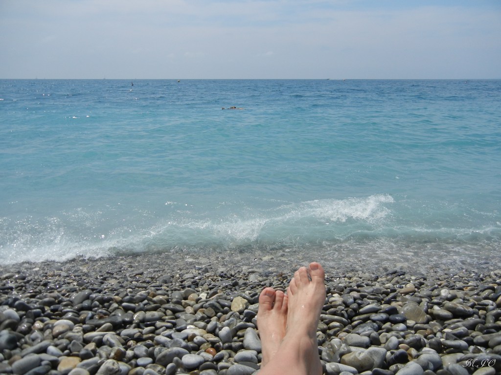 Aujourd’hui, je décide de relaxer et de m’installer sur le bord de la mer, la plage est en galets donc ce n’est pas très confortable pour les pieds, les fesses, le dos et encore moins sur le ventre. Mais je le savais avant de partir et j’avais apporté mes souliers d’eau pour me baigner. Il y a plus loin des petits resto-bars avec un bel aménagement de chaises longues et parasols, mais il faut les louer pour la journée et ça coûte 25 euro (environ 38-40 cad) , donc pour cette fois, je décide de rester sur les galets.
