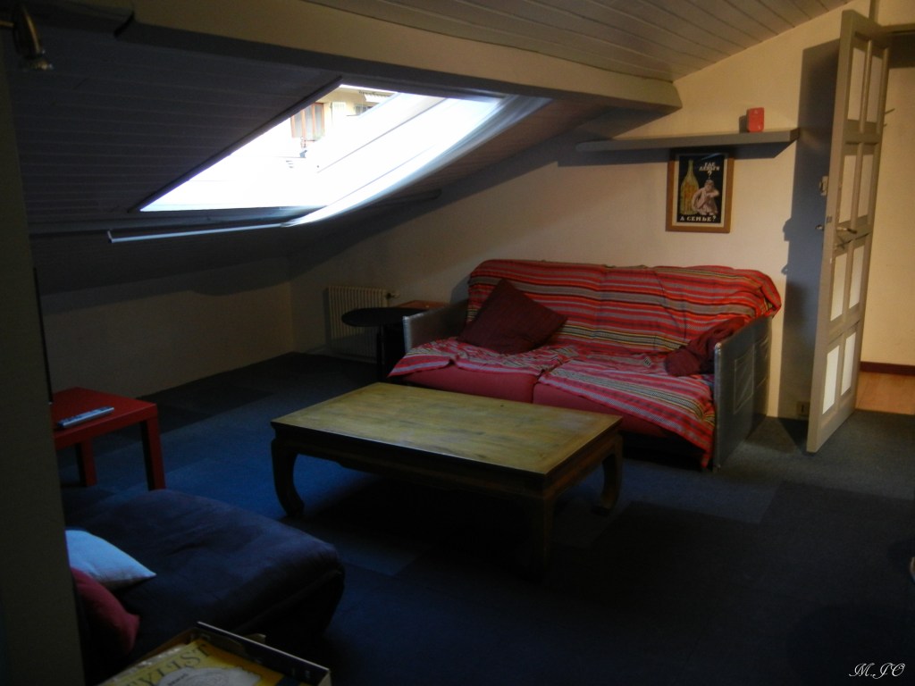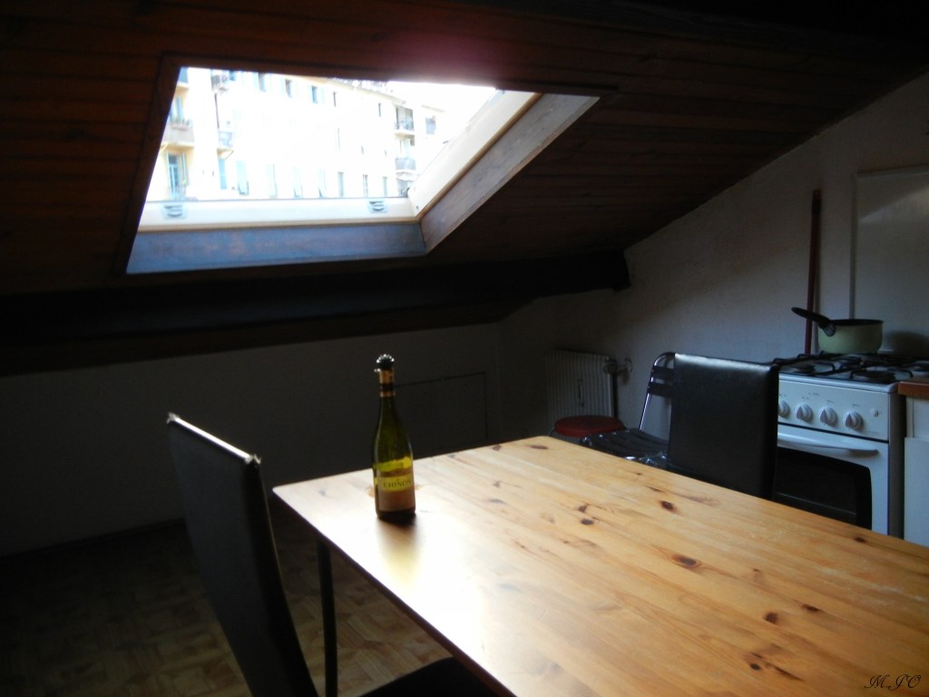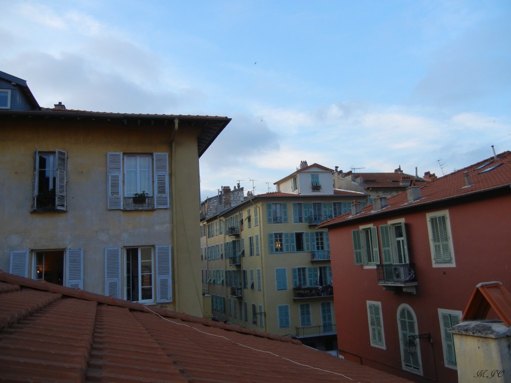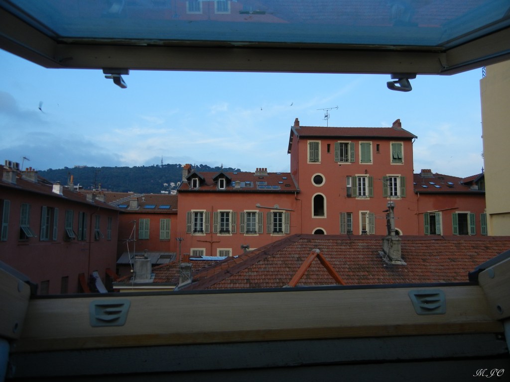 Dans ce quartier, les habitations sont très colorées, avec des fenêtres à volet garnies de paniers fleuries, de style vieillot, de style niçois. L’appartement compte seulement 2 étages et nous étions au 2ième étage. Ce qui est vraiment spéciale, c’est que les fenêtres de l’appartement étaient dans le plafond comme de grands puits de lumière qui s’ouvrent pour avoir une vue de la ville toute en hauteur!!