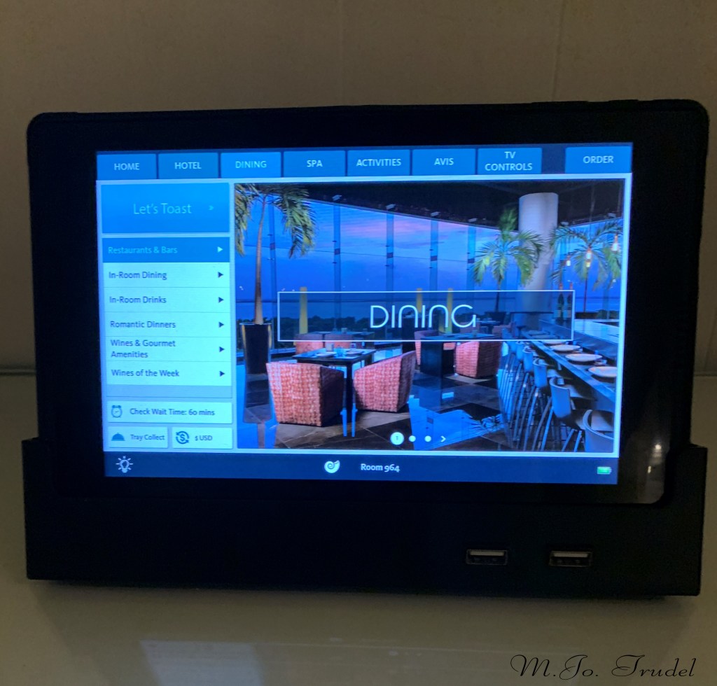 J’ai la chambre vue mer lit king en Club Preference. La chambre est propre, confortable et super spacieuse avec une très grande salle de bain avec douche parapluie. Le décor est très simple. Je suis dans la tour B, au 9ième étage. La chambre n’a pas de balcon, habituellement j’aime bien avoir un balcon , mais pour ce voyage c’était correct car demain nous partons à Holbox, donc je ne voulais pas payer le supplément pour la balcon avec piscine privée que je n’utiliserais pas assez. De ce que j’aime aussi de ce resort, c’est le service à la chambre 24h/24h et le Ipad qui nous indique tout ce qu’il a à savoir sur l’hôtel, les restos, les activités…