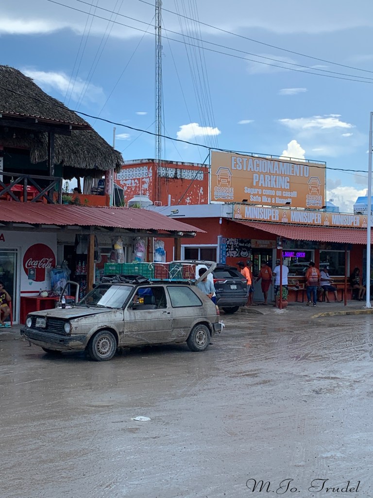Arrivé à Chiquila, nous devons trouver un stationnement pour prendre le traversier et se rendre à Holbox. Je dois dire qu’arrivée là, c’est le gros bordel! C’est comme un très petit village, en réno/construction et qui ne s’attend pas a recevoir des milliers de personnes. Donc embouteillage, rue en terre plein de trou et d’eau, n’importe qui veulent te vendre un stationnement. Nous réussissons à trouver une place près du quai et à acheter un billet pour le traversier. Ils nous en coûte 220 peso Mexicain + 58 peso pour la sauvegarde de l’environnement de l’ile, par personne (+-20$cad).
