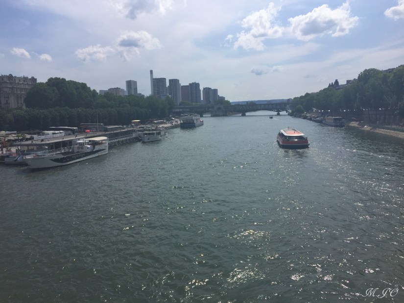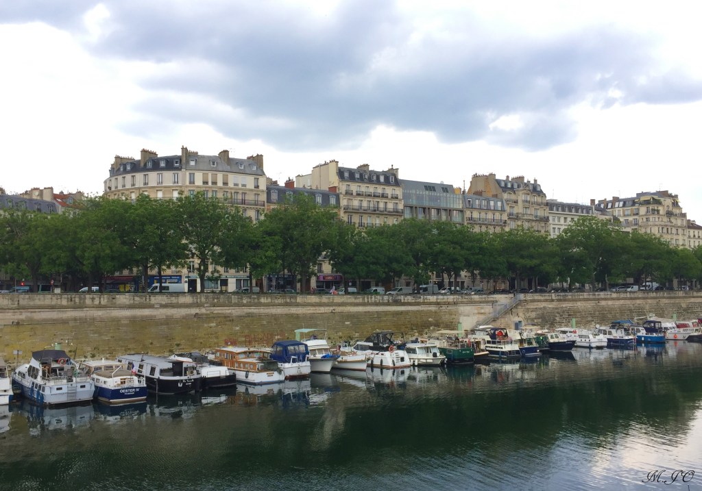 Le canal va jusqu’au bord de La Seine, (C’est un Fleuve Français important, il mesure 775km. Il prend sa source à Source-Seine dans la région de Bourgogne, à 450 mètres d’altitude, et se jette 775km plus loin dans la Manche où il y a la ville Le Havre. Il passe par plusieurs villes). Il y a un banc pour me reposer un peu et profitez de la vue. De loin, je vois la belle Cathédrale de Notre-Dame de Paris!