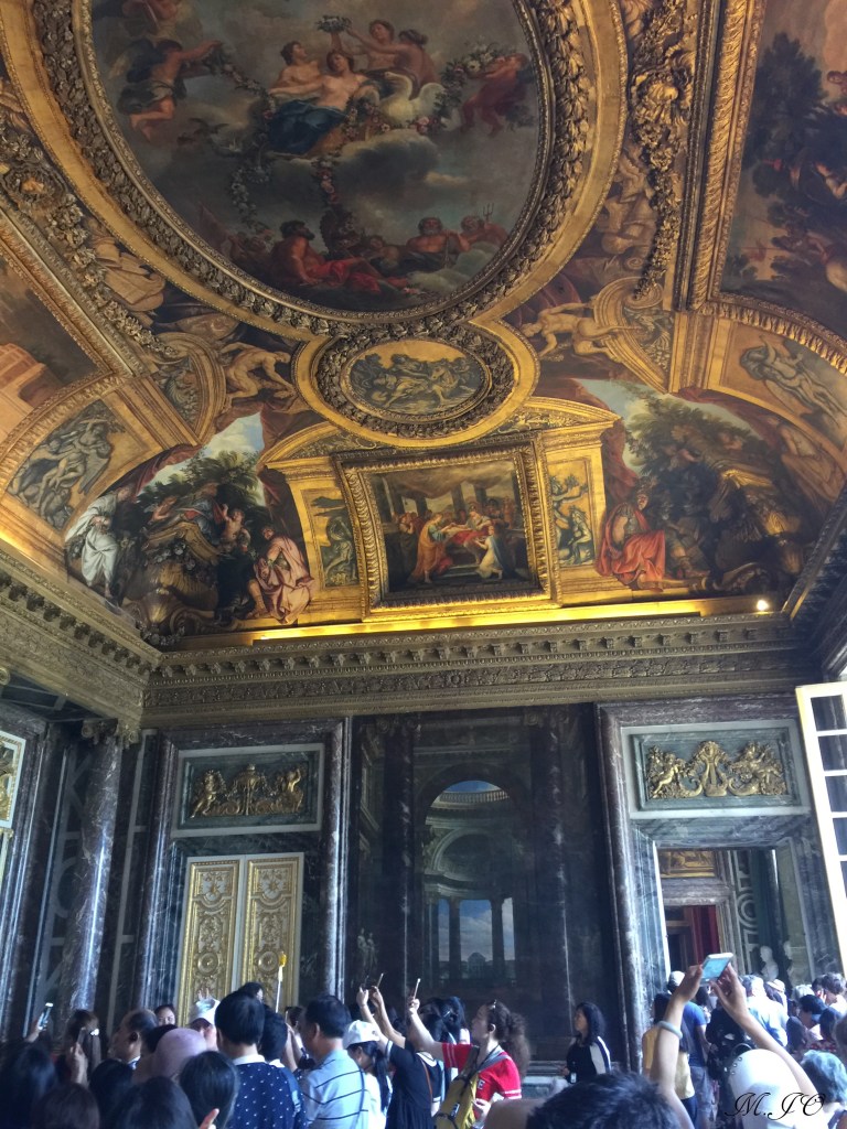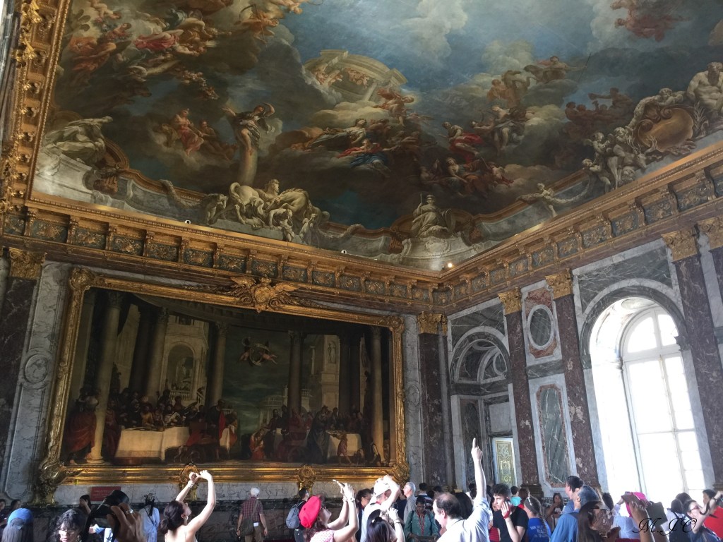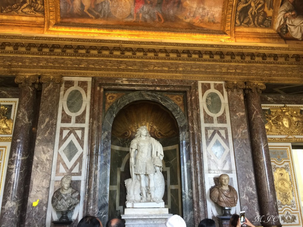 On peut visiter plusieurs pièces dont les appartements du roi. Le must est la galerie des Glaces, WOW!! La pièces est immense, d’un côté elle est pleine de miroir mur a mur et de l’autre côté de très grandes portes vitrées avec du marbre en guise de mur. La vue des fenêtres est superbe, nous avons la vue de l’Allée Royal, sur le jardin central , sur le bassin de Latone, sur le bassin de d’apollon et le grand canal. Dans la pièces, il y a de gros lustres en cristal au plafond entremêler entre les voutes avec des fresques colorées du plafond et de moulure en or. Il y a beaucoup de statues. La pièce est superbe, au temps de Louis 14, elle servait surtout de passage, de salle d’attente et de rencontres. Fréquentée par les courtisans et le public des visiteurs, elle servit aussi à de rares occasions, à des cérémonies, bals et réceptions.
