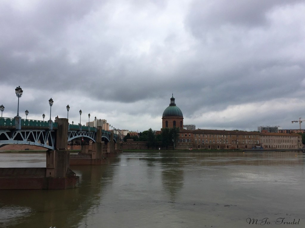 Sur la prochaine photo, c’est le plus beau point de vue de la ville, on est sur le bord de la rivière La Garonne. On y voit le Pont Neuf (un peu contradictoire, car il a été construit en 1543), l’hôpital La Grave avec sa coupole verte, et en avant plan, la bâtisse de l’Université de l’hôtel-Dieu-Saint-Jacques.