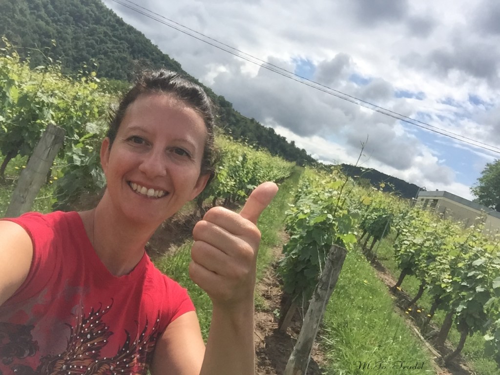 Le propriétaire est super gentil et très content de m’accueillir. Il me raconte l’histoire de sa famille, du vignoble, la fabrication du vin, me fait déguster plusieurs vins. Par la suite, nous partons en voiture pour faire la tournée du coin , je vois des montagnes, des châteaux, des vignobles, des vignes à perte de vue, le paysage est superbe! Nous arrivons à ses vignes et il m’explique la préparation et l’entretient des vignes. Ils cultivent aussi des Kiwis et des cerises.
