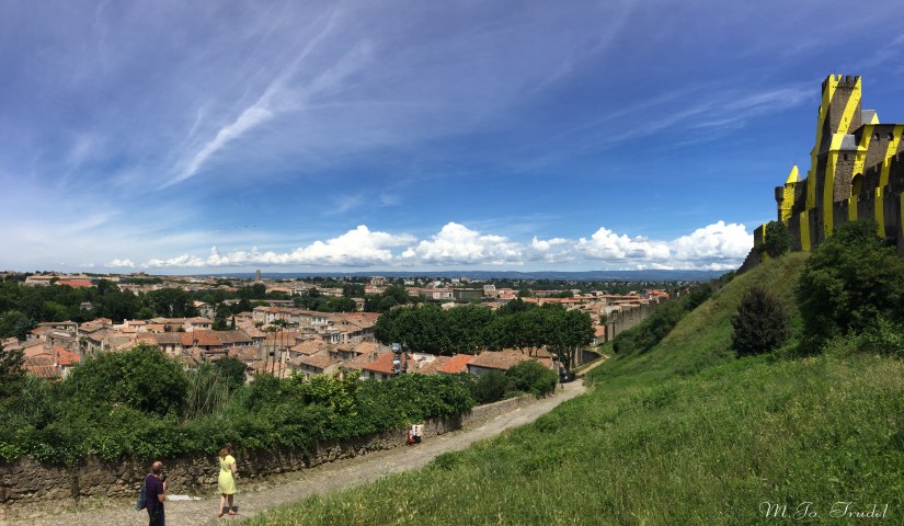 Anecdote: lorsque j’ai visité Carcassonne, il y avait des bandes jaunes partout, c’était inhabituelle et on se demandait tous c’était quoi? Lorsque, j’arrive en bas, il y avait une affiche qui expliquait que c’était une école qui faisait une expérience spéciale ce mois-là. Et voici ce que ca donnait rendu en bas et qu’on était dans le bon angle. Hahaha quelle chance, intéressant mais je dois dire que ça enlève un certain cachet!