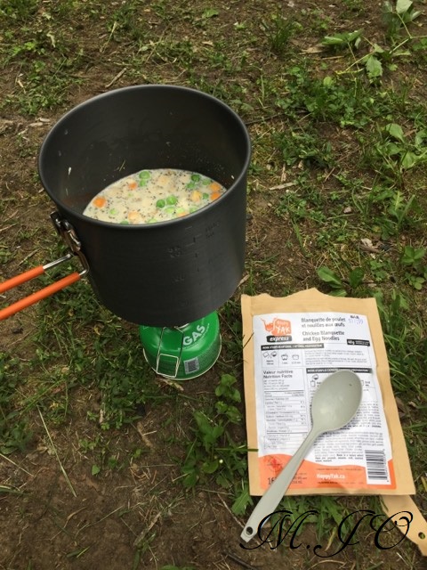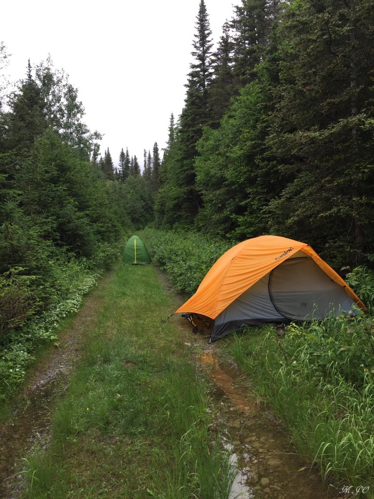 Toujours au Jour 1, nous arrivons au refuge (camping et abri du lac Matane) qui donne sur le lac Matane. Il pleut depuis ce midi, mais tout le monde garde le sourire! Nous pouvons quand même nous abriter dans le refuge. Nous en profitons pour jaser un peu, faire connaissance et pratiquer des nœuds. Lorsque la pluie cesse un peu, nous allons installer les tentes sur les plateformes pour ceux qui comme moi, dormiront en tente. Il y a une belle entraide entre nous. Par la suite, nous sortons nos réchauds et notre nourriture pour faire notre souper. Nous discutons de divers trucs, on parle de nourriture, recettes, on se montre nos équipements. Nous sommes 2 par 2 pour le partage des tâches pour les repas et la vaisselle. En fin de repas, nous allons mettre nos sacs de nourriture à l’abri des animaux dans les toilettes sèches, oui oui vous avez bien lu, ça ne semble pas très attirant de mettre les sacs à cet endroit là, mais ce sera à l’abri des ours, raton-laveurs, écureuils ou toutes autres bestioles qui se promènent la nuit.