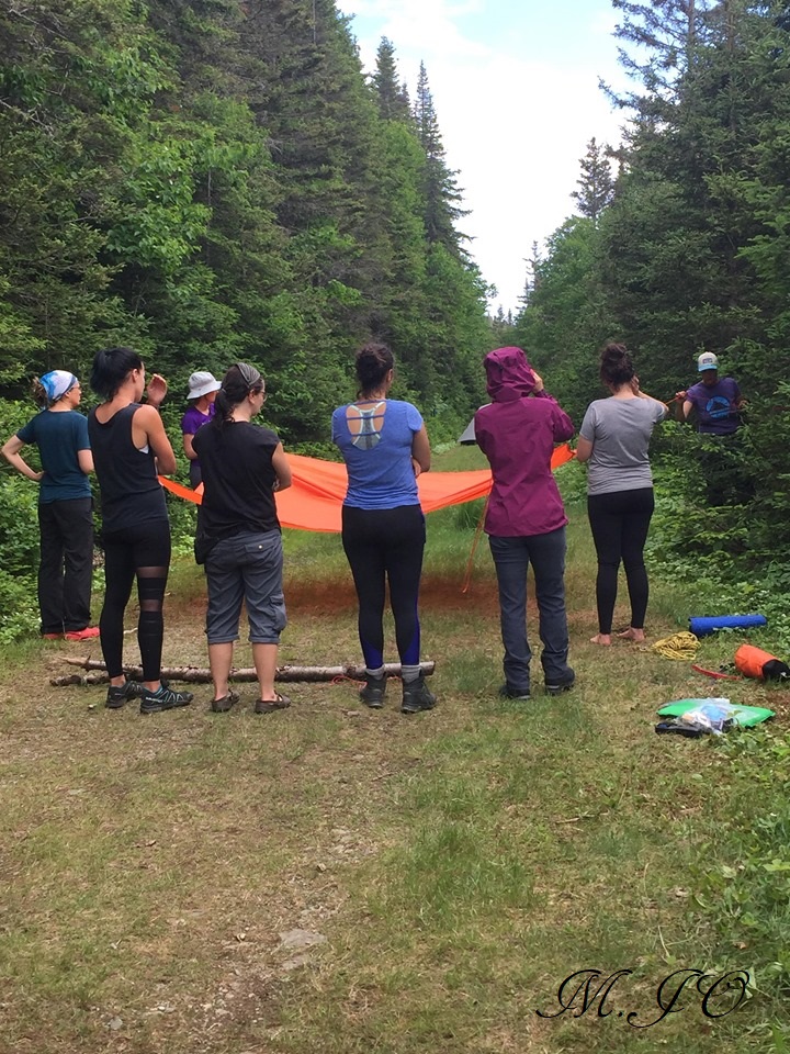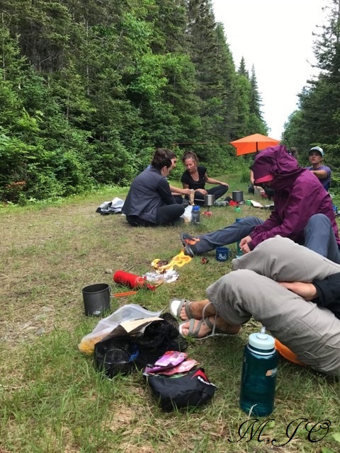 La montée fût quand même bien, nous prenons km par km, moi perso, j’arrêtais assez souvent, et nous étions 2-3 filles avec le même rythme. Pour les dîners, nous avons dans un sac plusieurs collations (barres tendres, barres aux fruits, fromage, saumon fumée, saucissons, carottes, noix, mangues séchées….) et à chaque 20 minutes, nous nous arrêtons pour boire et manger quelque chose. Comme ça, nous ne perdions pas notre énergie! Rendu en haut, il faisait tellement chaud que nous nous sommes rafraichies avec l’eau de la rivière, mais il y avait tellement de moustiques qui nous courraient après, qu’on a fait ça assez rapidement !! Par la suite, nous avons monté nos tentes (camping et abri de la Montagne à Valcourt) et nous avons continué notre formation.