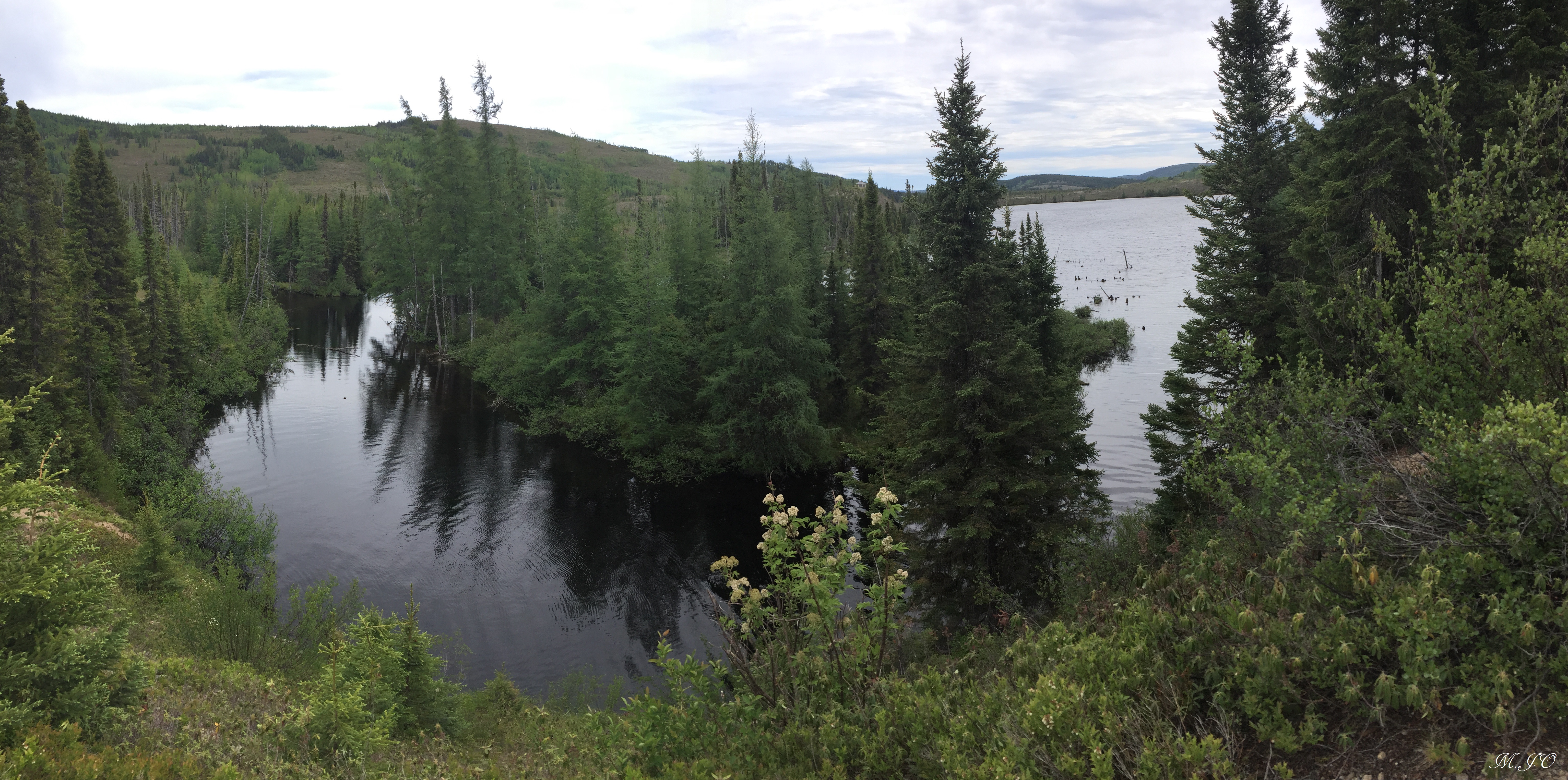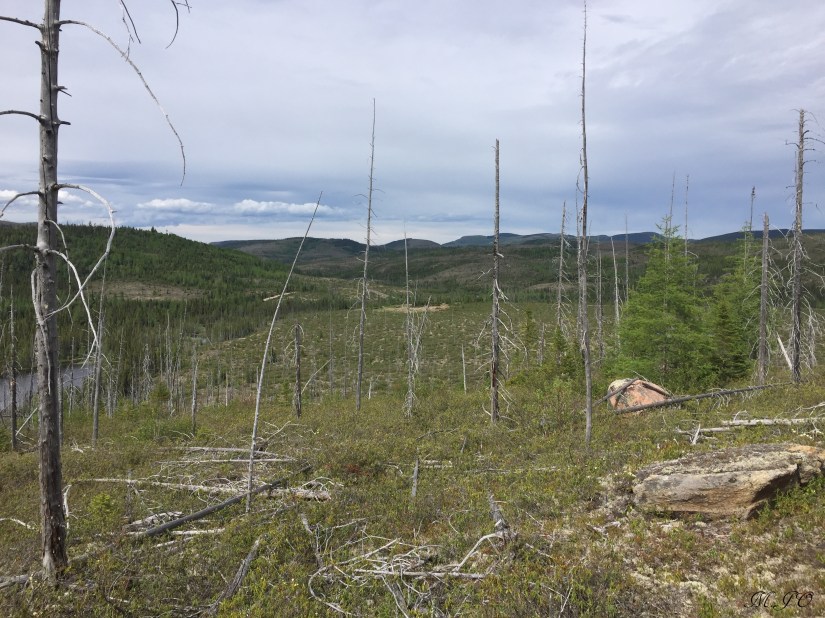 Donc, nous partons en randonnée avec aucun équipement, sans collation, n’y eau, pensant partir se promener pour environ 1 heure. Nous avons su après que le sentier Le Brulé était une boucle de 10.2 km, de niveau intermédiaire, avec un dénivelé de 164m et qui nous a pris 4h30. Au début, le sentier monte et il y a très peu d’arbres à cause des feux. Au sol, il y a des Castillejas, une sorte d’herbe basse fleurissante à haute altitude. Par la suite, on redescend pour entrer dans la forêt boréale, c’est donc là mon lien avec les ours. On voit pleins d’arbres sans feuille, mais avec pleins de poils noir d’ours. La peur me prend, j’ai mal au ventre, mais qu’est-ce que je fais là avec mes 2 enfants sans aucun réseau cellulaire et surtout sans équipement de base avec nous. Habituellement, je traine toujours une trousse de secours dans mon sac à dos avec mon canif, un briquet, un sifflet… bref au moins quelque chose pour se défendre et lancer un SOS!!!
