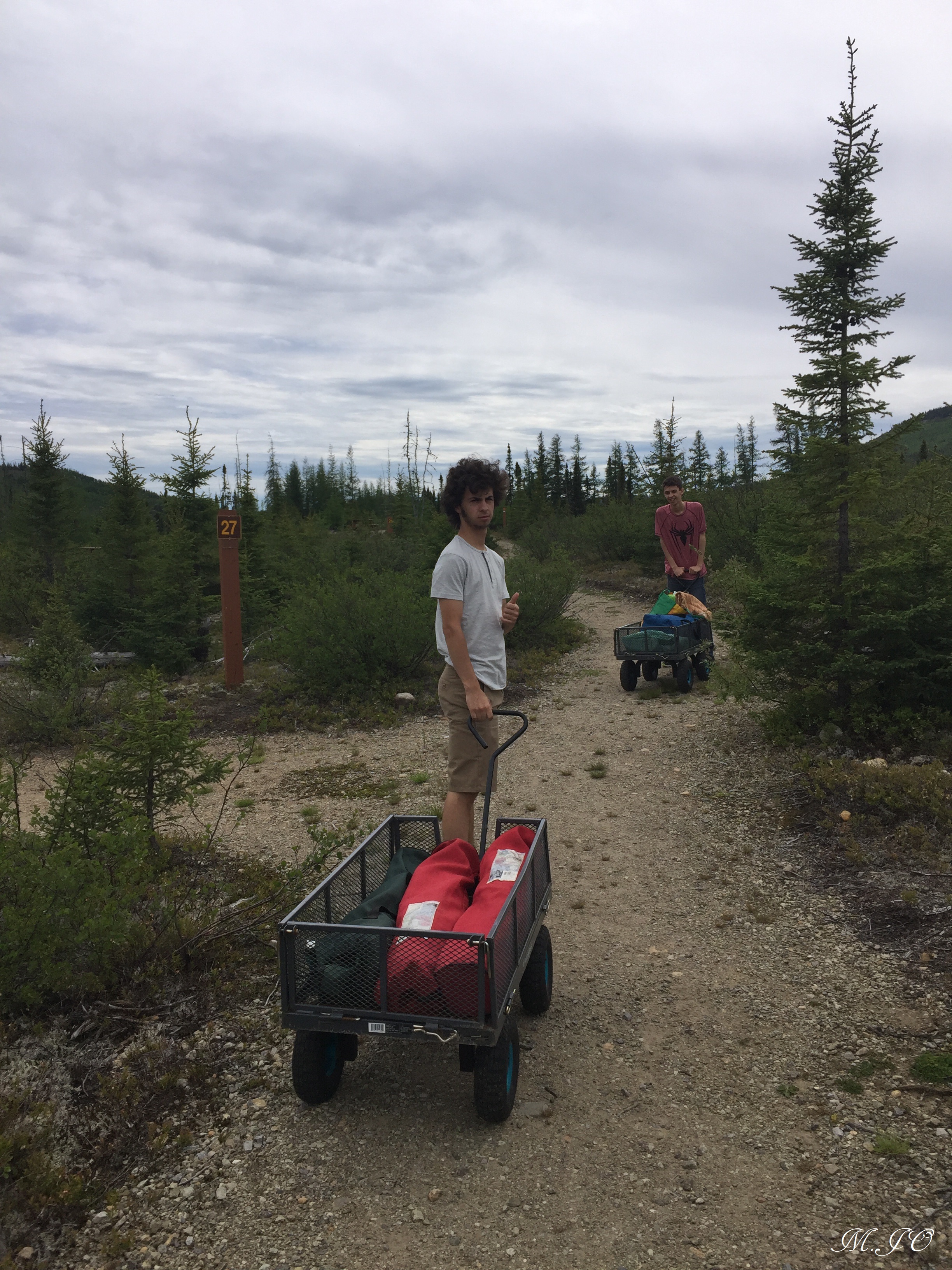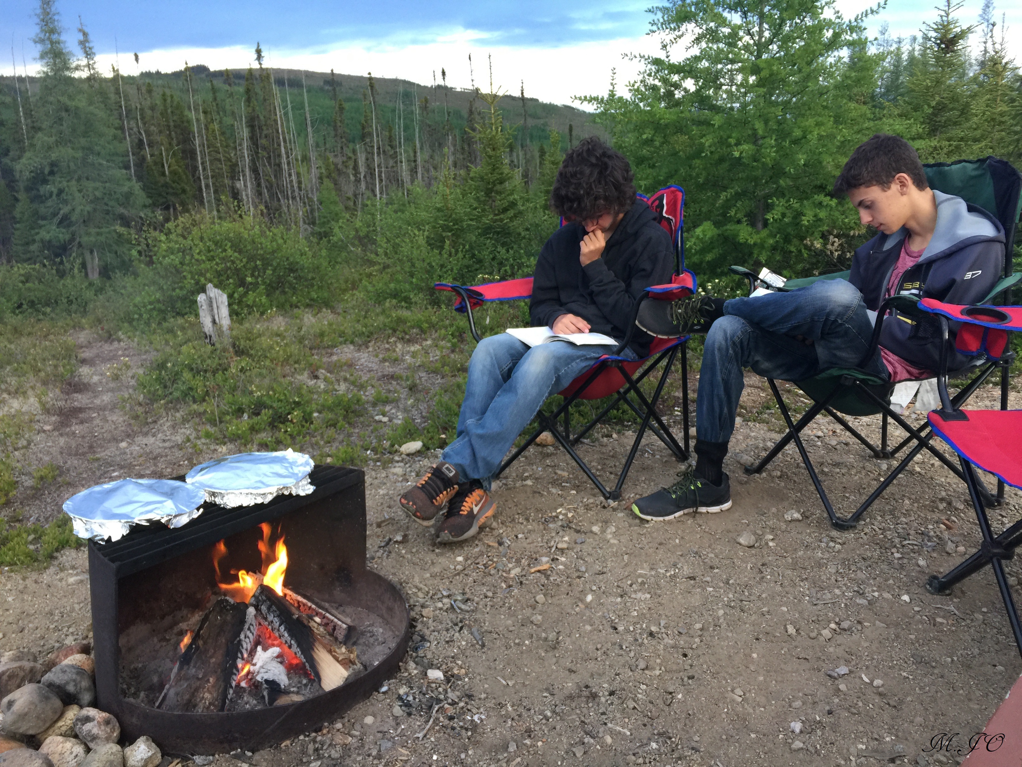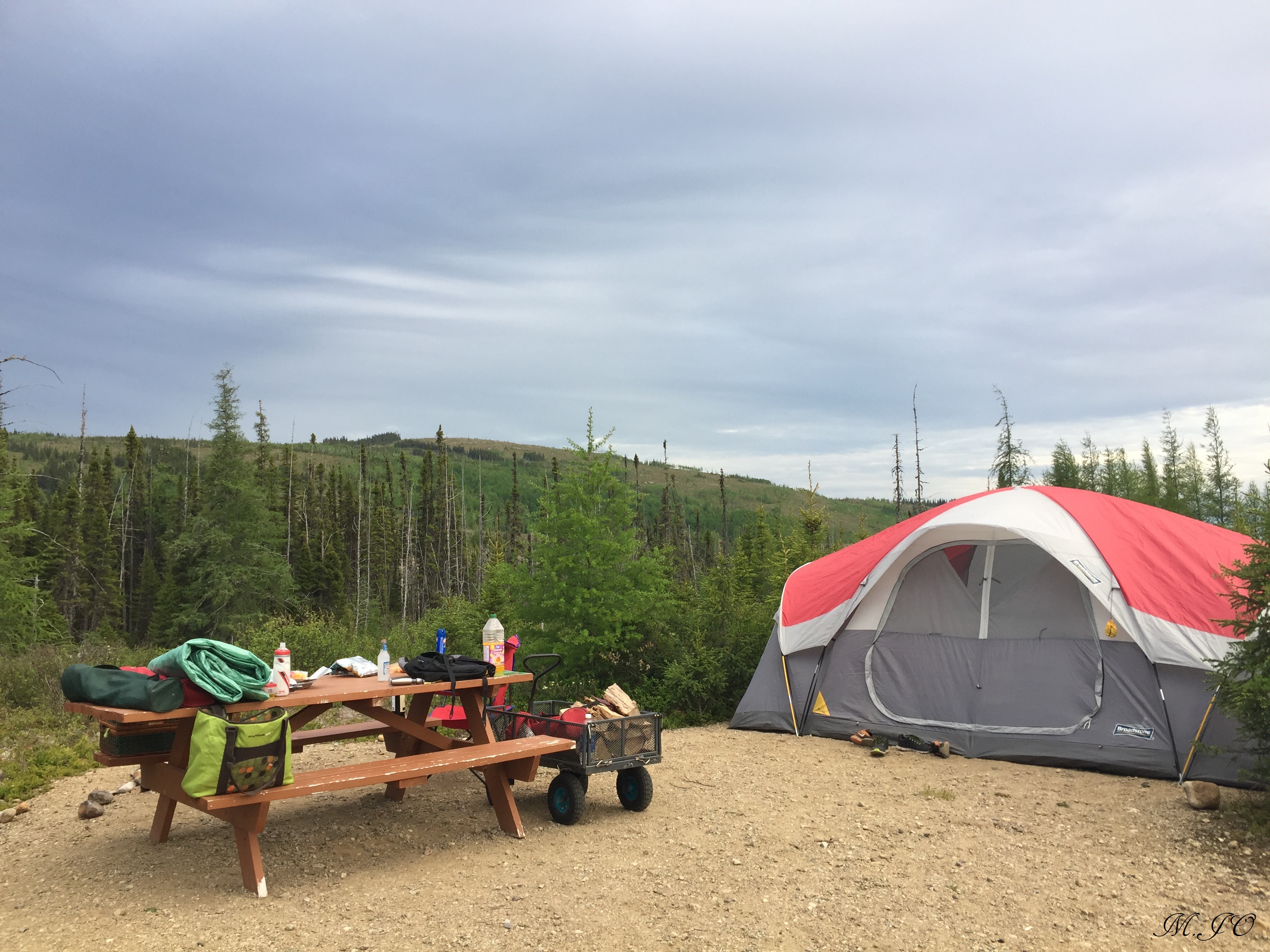 Le camping est un camping piétonnier, emplacement #29, donc nous stationnons la voiture et nous apportons nos trucs à notre emplacement à pied sur quelques mètres, il y a souvent une brouette de fournie pour nous aider avec nos trucs. Nous arrivons au terrain et on s’installe, les gars sont plus ou moins contents du travail qu’ils ont à faire, mais bon c’est des ados!! Le terrain est assez boisé, assez loin les uns des autres et désert. C’est très tranquille. Les arbres sont quand même petits car nous sommes en altitude. Ho non, sur la table de pic-nic, il y a une grosse affiche d’information « n’oubliez pas que vous êtes dans le pays de l’ours brun » ne laissez aucune nourriture sur le terrain et dans votre tente, reportez le tout dans votre voiture! Hooo mon dieu!!! Je commence à avoir peur de voir des ours!! Mais, je fais semblant de rien devant mes enfants!