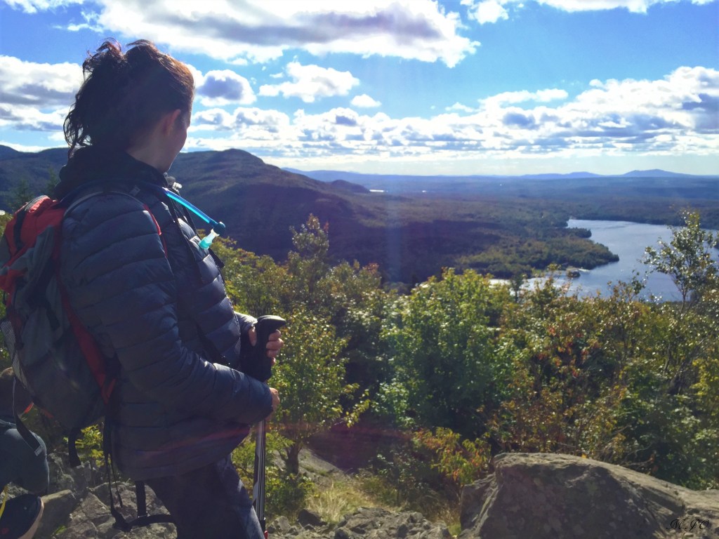 Je voulais aussi tester mon équipement, car si on veut faire un sport, pour aimer ça, on doit avoir les bons équipements, comme changer ses espadrilles pour une bonne chaussure de randonnée, des bâtons (pour ma part, je préfère avoir 2 bâtons pour équilibrer le poids du corps en montée ou en descente), un bon sac a dos de 20-25 litres est suffisant pour 1 journée. Prévoir aussi, surtout lorsque l’on part pour plusieurs heures, de l’eau en quantité suffisante environ 1.5 a 2 litres pour une journée, un diner, des collations et une trousse de 1er soin. J’apporte aussi toujours une paire de bas de rechange, car il y a rien de pire que d’avoir les pieds mouillés et d’avoir des ampoules. Pour l’habillement, je pars en legging (ou pantalon de rando) et avec un multi-couche pour le haut. Dans mon sac, j’ai un petit manteau en duvet qui est plus chaud et très léger à transporter, car nous sommes au mois d’août, mais en haut de la montagne c’est toujours un peu frais.