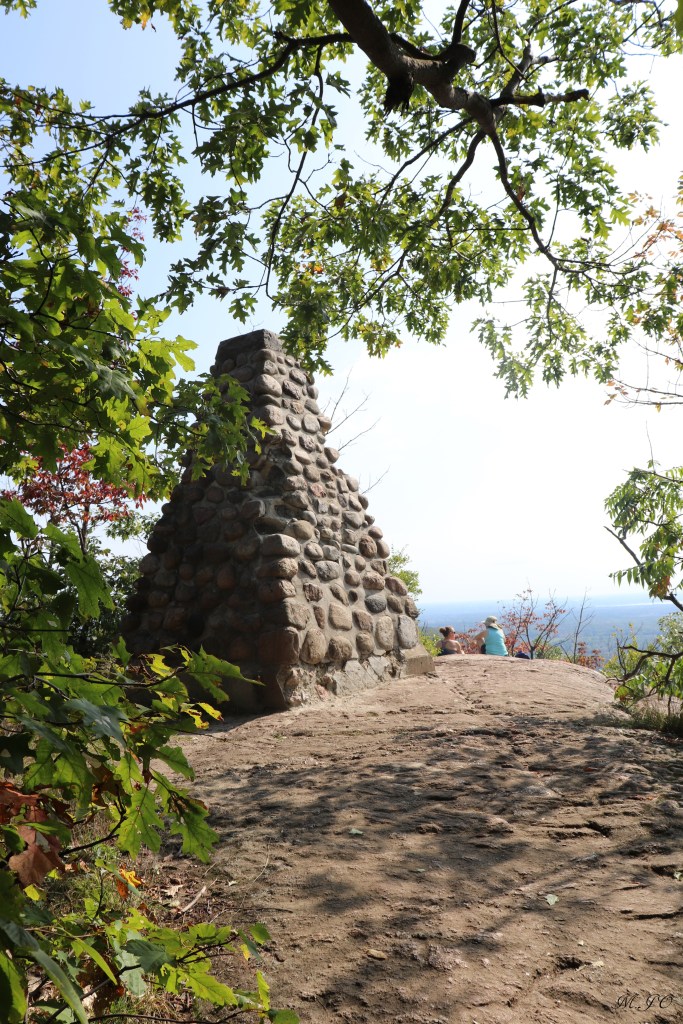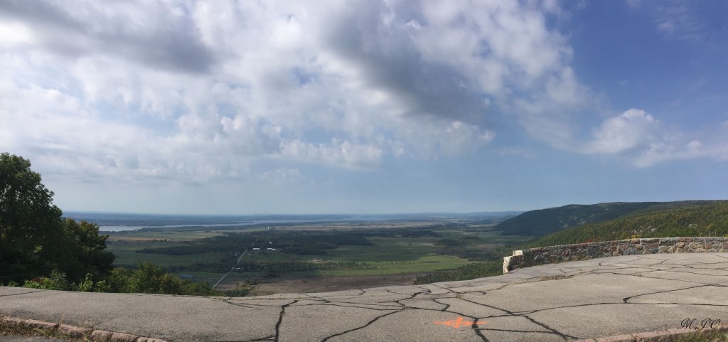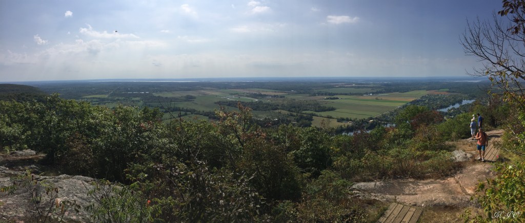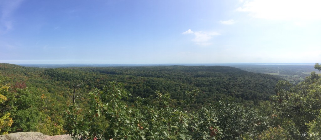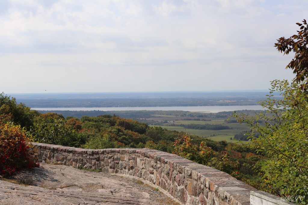 Pour aller au Belvédère Champlain, qui est à 335 mètres d’altitude, on doit reprendre la route sur la rue principale. En sortant du Mont King, je tourne à gauche sur la rue Promenade Champlain, en roulant jusqu’au belvédère Champlain, on croise le belvédère Huron et le belvédère Étienne-Brulé, celui où j’ai fait un pic-nic. Les belvédères se font en voiture ou à pied par différents sentiers de randonnée qui passe dans la forêt, si on a du temps. Car du Mont King au belvédère Champlain, c’est un bon 11 km et il faut calculer un bon 2h30 pour l’aller seulement. Du haut de chaque belvédère, la vue est semblable. Montagnes, verdure et la Rivière des Outaouais.