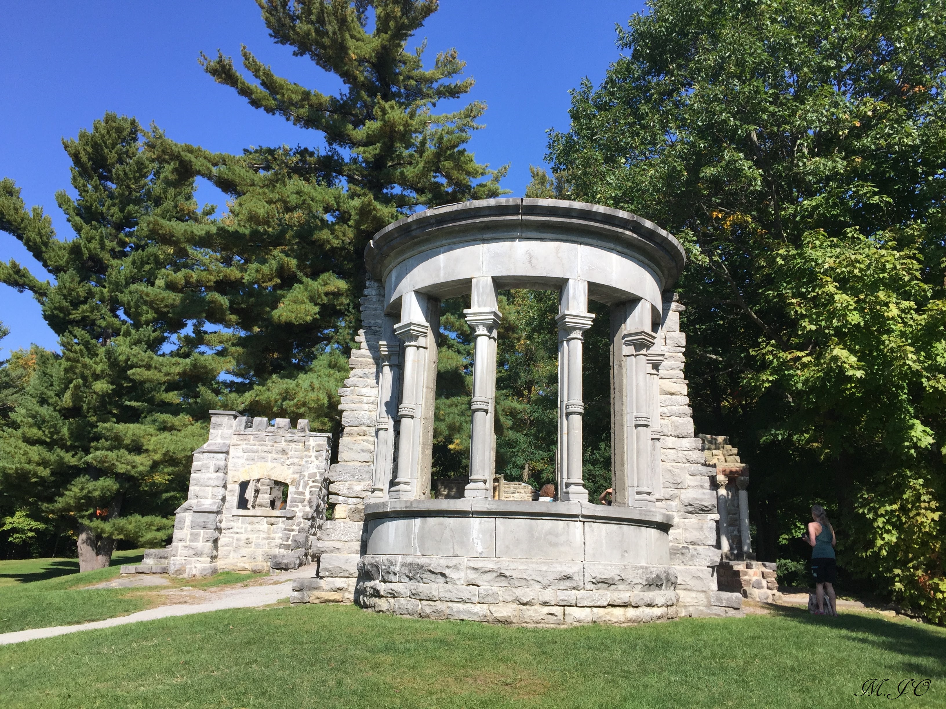 Les jardins de la demeure principale sont superbes. À l’arrière du domaine, il y a une grande terrasse avec une profusion d’arbres, de sapins et de fleurs. On peut se promener longtemps pour admirer ses jardins de style anglais. Il y a 3 ruines à voir dans les jardins, l’arc de triomphe (1) qui vient de l’édifice de la British Americain Bank Note Compagny à Ottawa lorsqu’elle fut démolie en 1936, la fenêtre sur la forêt (2) et l’Abbaye (3-4-5). Il y a aussi le sentier des chutes du Voile-de-la-Mariée qui est à ne pas manquer.