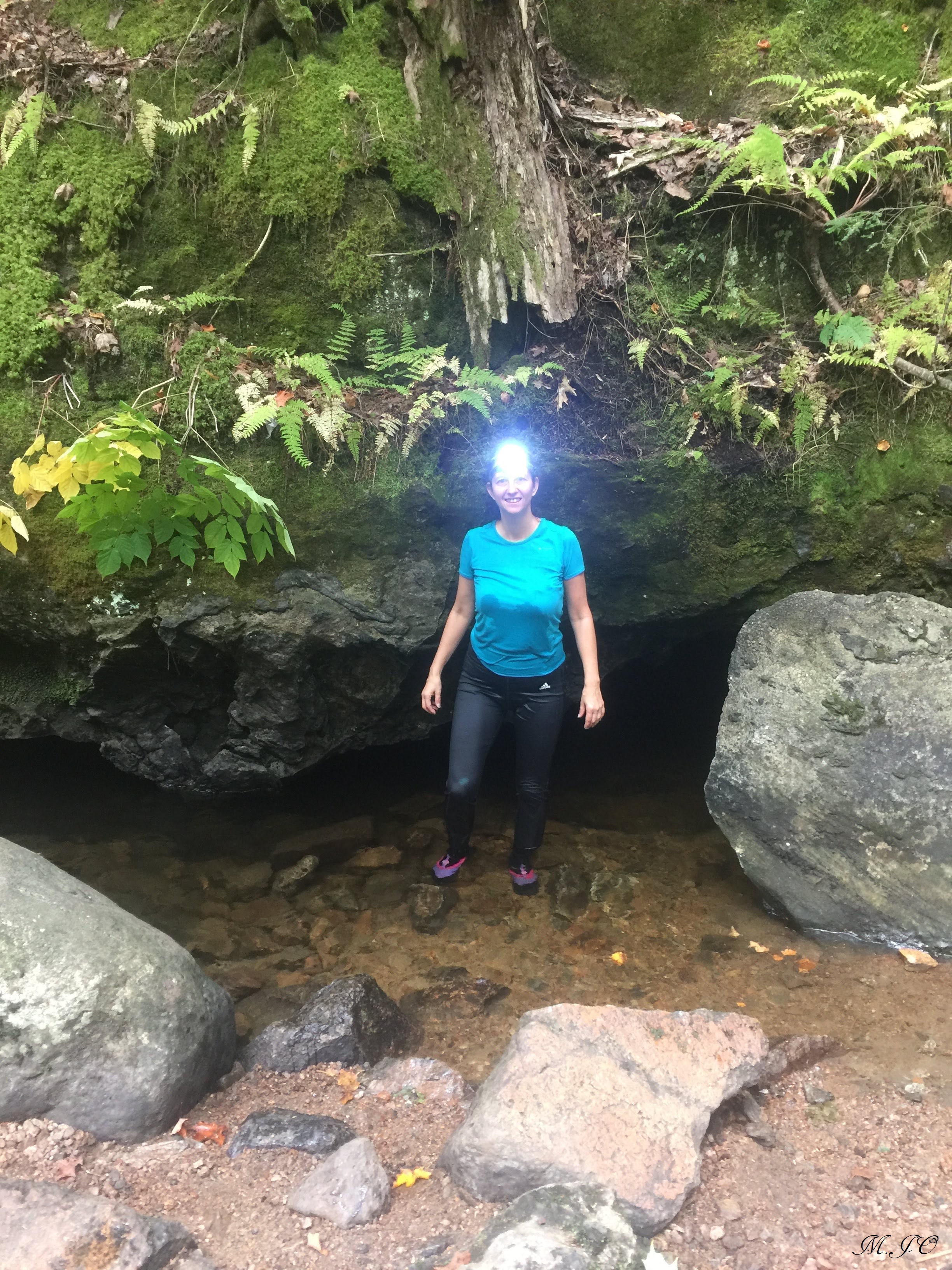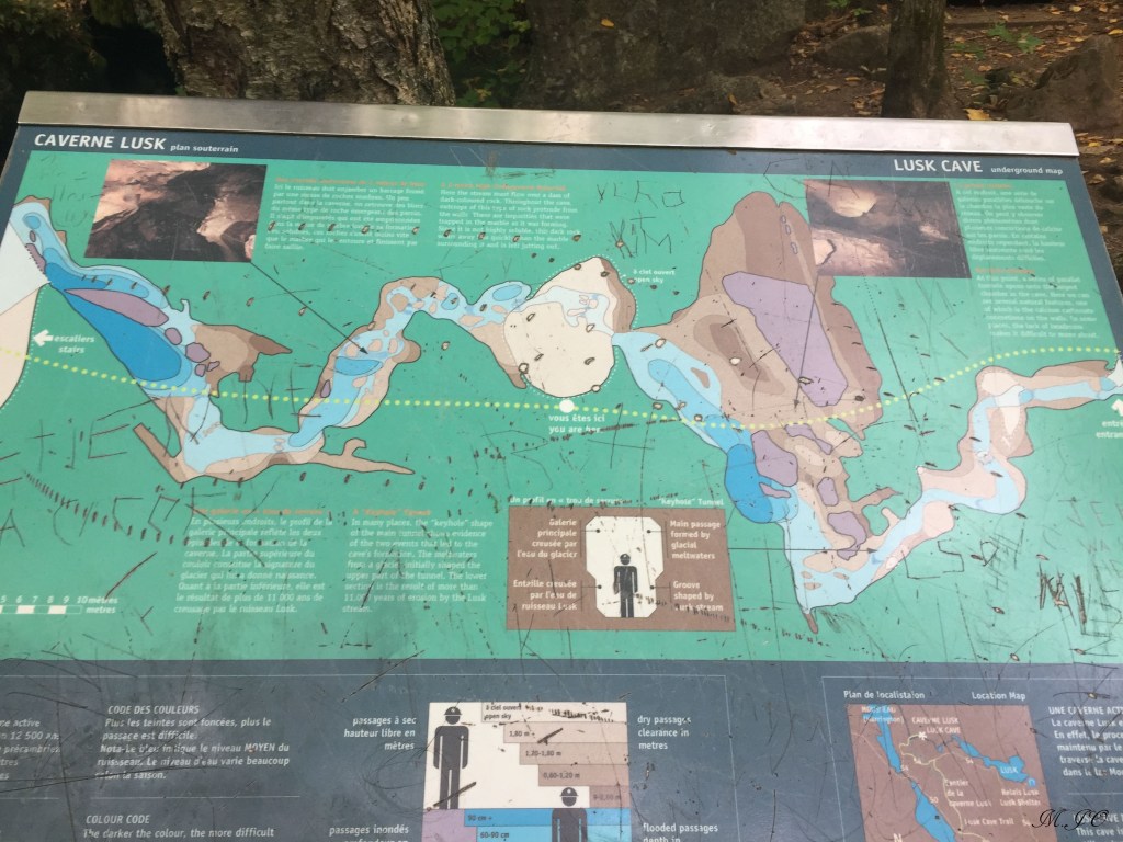 Le dimanche était réservé à décamper et à la randonnée pour aller faire la Caverne Lusk. La randonnée est facile et n’a pas beaucoup de dénivelé. On commence par quelques km sur le sentier principal qui est en petite roche (piste cyclable) pour ensuite entrer dans un sentier en forêt. Lorsque j’arrive à la caverne, je me sens moins brave d’y entrer seule car on rentre dans un trou de roche complètement noir. J’attends donc un couple qui était juste en arrière de moi et qui arrive un peu après moi. Je leur demande si je peux rester près d’eux pour traverser la caverne? Il n’y a pas de problème, super!! Il y a un plan à mi-parcours de la caverne pour savoir comment s’y prendre.