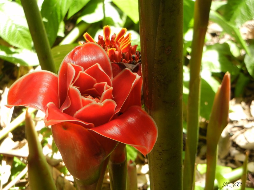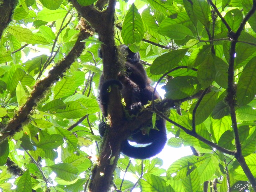 Nous marchons dans la forêt tropicale et c’est vraiment trippant. La végétation est géante et on entend différents sons d’oiseaux et d’animaux. Le sentier est bien aménagé, il y a plusieurs ponts à traverser, une cascade et des petites rivières. La température est très humide et il fait vraiment très chaud. Ce qui est le fun d’avoir un guide, c’est qu’il nous explique ce que l’on entend, ce que l’on voit comme les fleurs, les plantes, les oiseaux, les insectes, les petits lézards, les toucans (à la photo 4, qui est en passant ma meilleure photo d’un toucan, car c’est difficile de les photographier en pleine nature, ils se tiennent super haut dans les arbres et ils sont durs à voir à cause des feuilles), un capucin à tête blanche avec son bébé, et en revenant à la fin du parcours, on a rencontré un groupe de singes hurleurs, on dirait qu’ils jappent, c’est assez spécial, surtout quand ils sont plusieurs à hurler c’est comme un peu épeurant! Voir mon vidéo « singes hurleurs » : https://fb.watch/3ONlIDfYMP/