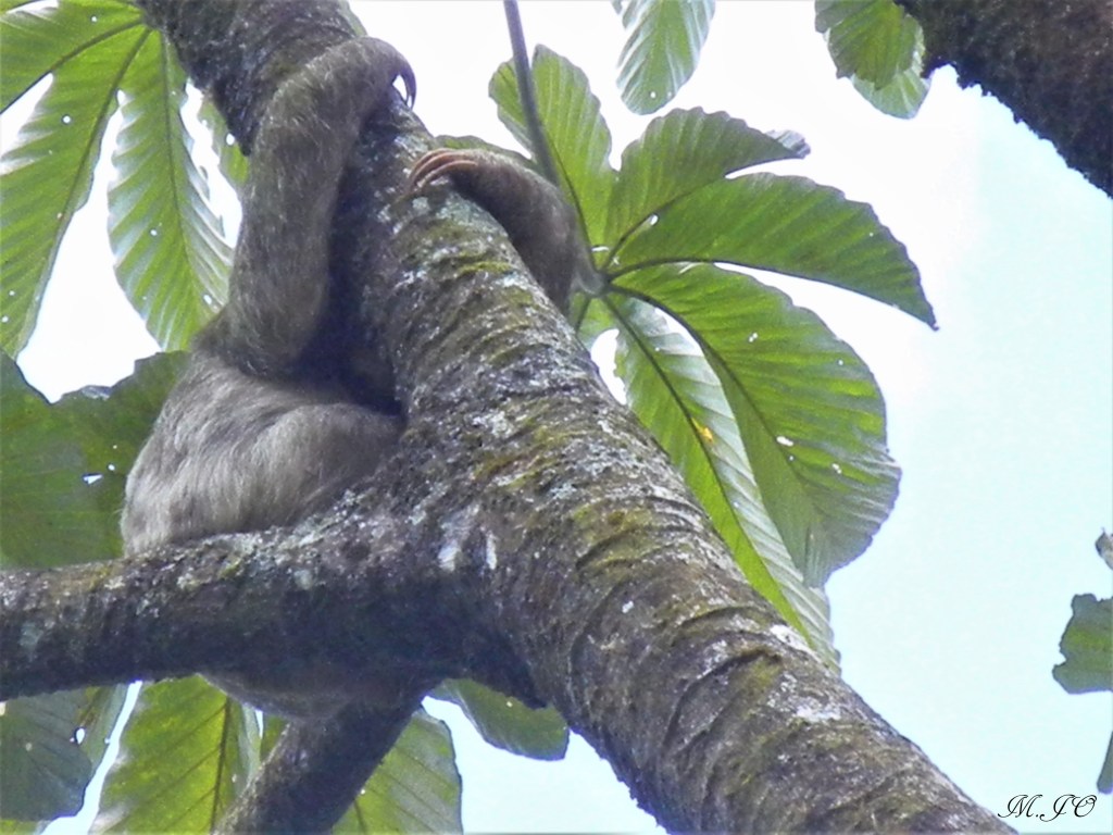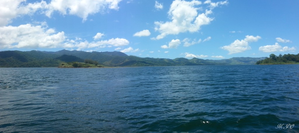 Les paysages sur la route sont superbes, c’est moins aride et il y a plus de verdure et de fleurs, car nous traversons des montagnes. Nous traversons un grand parc d’éolienne. Un peu plus loin sur la route le chauffeur arrête en plein milieu de la route?? Il fait descendre tout le monde et nous dit d’apporter nos jumelles et caméras?? Mais qu’allons-nous voir au milieu de nul-part?? Et bien, il y a plusieurs paresseux à cet endroit dans les arbres, wow!!!! Ils sont super beaux, il faut vraiment avoir des bonnes jumelles et un super zoom sur nos caméras, car ils sont brun pâle comme l’écorce des arbres et ils sont perchés super haut! La plupart dorment, mais on en voit un ou deux la tête en bas, bouger très très lentement sur une branche. J’ai pu en capter un qui dormait bien accroché au tronc! Après cet arrêt, nous arrivons dans le petit village Nuevo Arenal, pour diner dans un restaurant local Le Lajas, menu de poisson ou poulet grillé avec riz aux légumes assaisonnés, le tout servi avec jus de fruit frais, entrée et dessert. Par la suite, nous nous rendons au point de départ pour notre croisière de 1h30 sur le Lac Arenal.