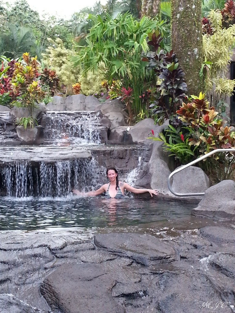 Après notre après-midi dans la forêt tropicale, nous allons relaxer quelques heures dans une source thermale. Au Titokú Hot Springs. L’endroit est superbe, beaucoup de fleurs, d’arbustes, de verdure. Il y a plusieurs bassins et l’eau est super chaude. L’eau est chaude naturellement, car il y a plusieurs volcans au Costa Rica et étant en terre volcanique, le sol est tellement chaud qu’il chauffe les eaux environnantes.