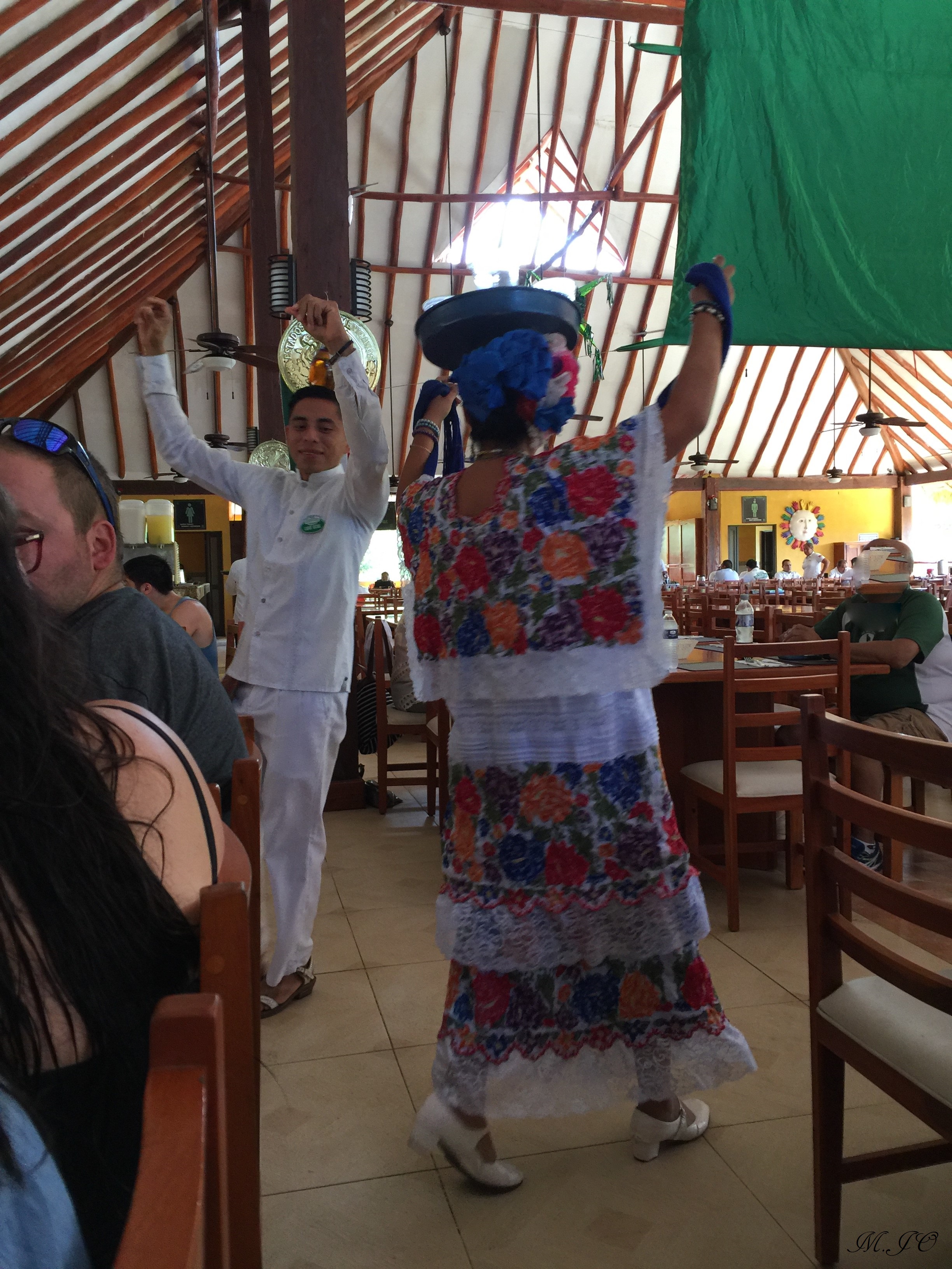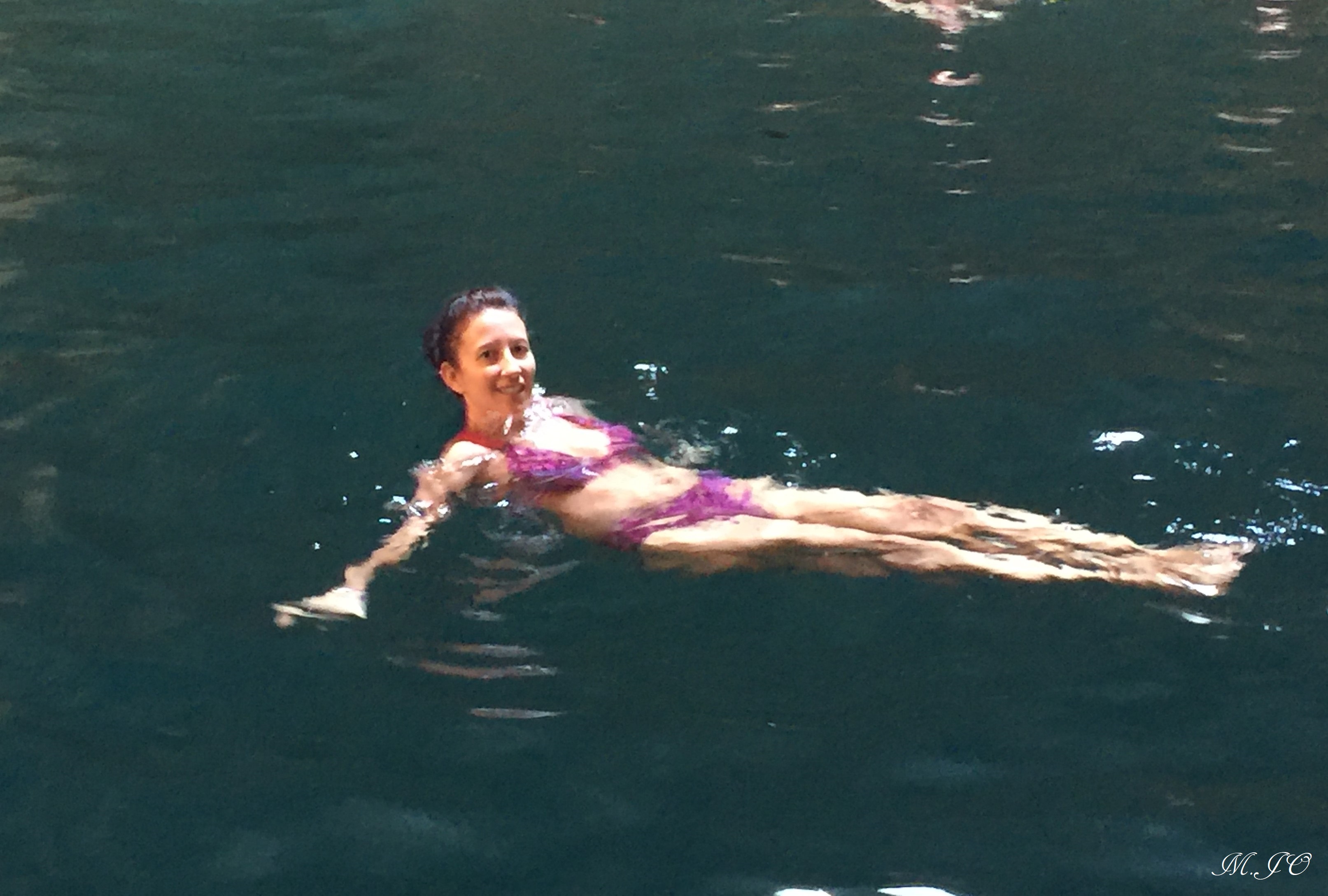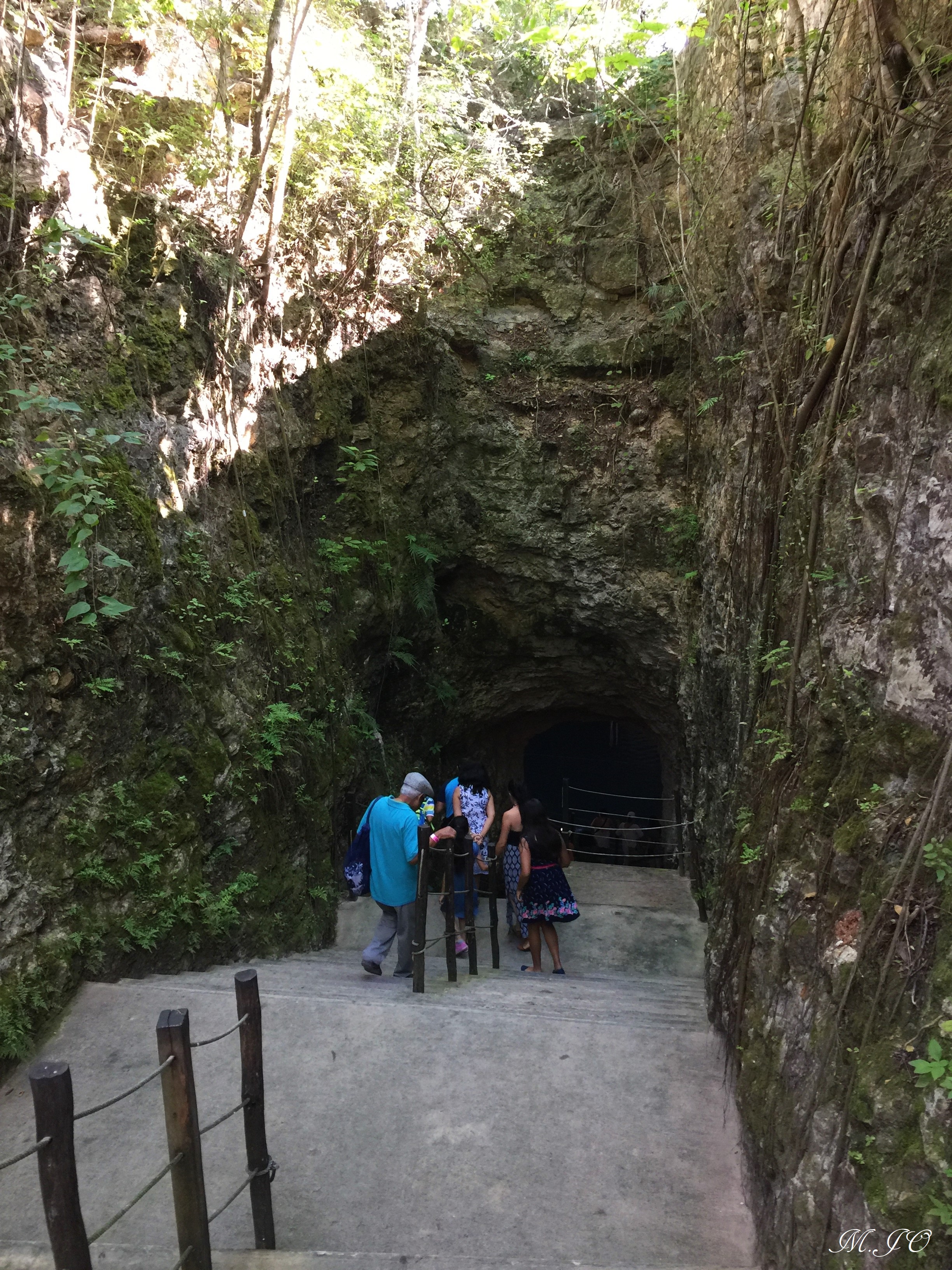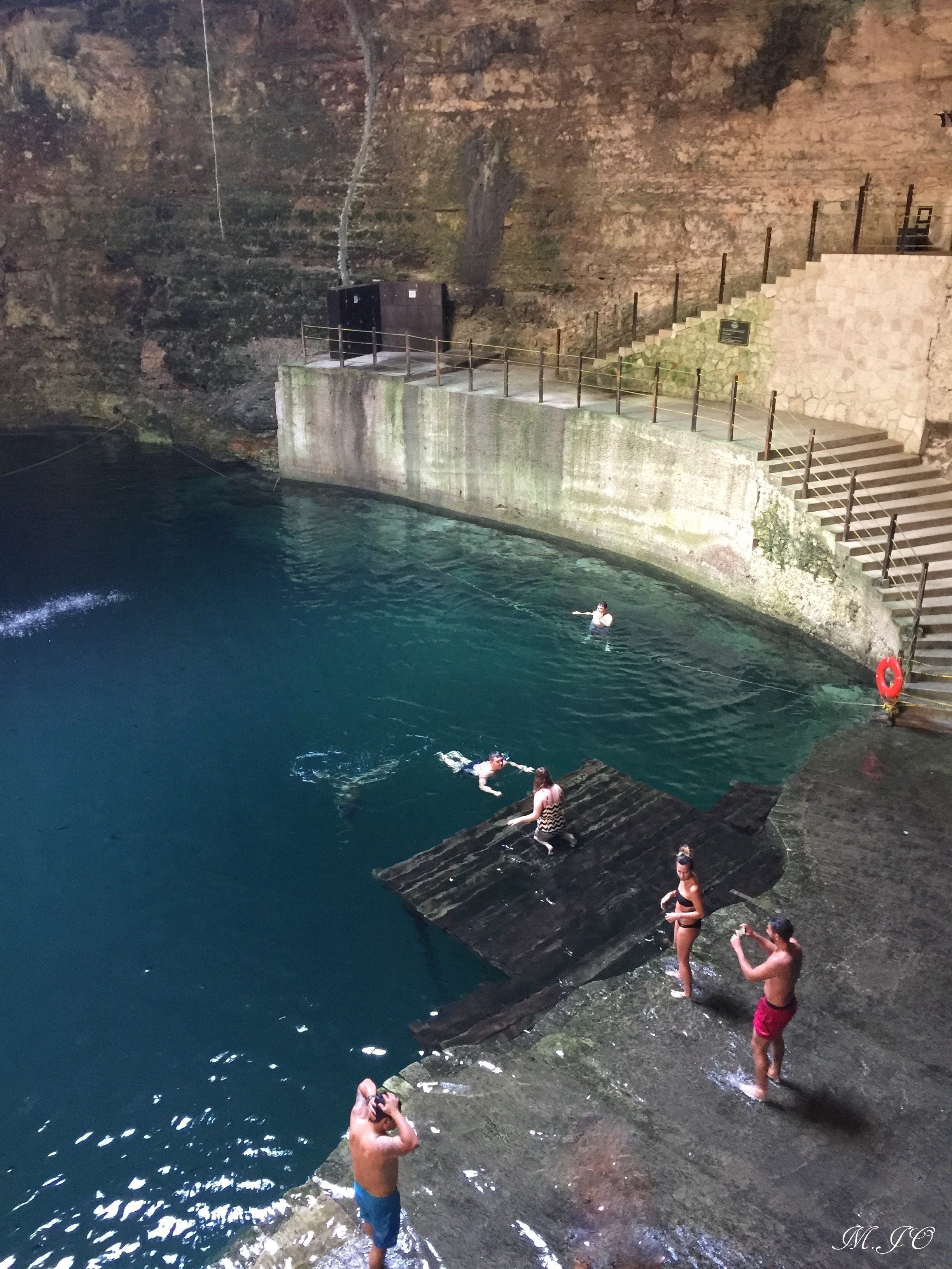 Dans le temps des Mayas, ils avaient donné un caractère sacré aux Cénotes, l’un de leur rituel était d’y jeter des offrandes et d’y faire des sacrifices humains. Dans le Cénote que l’on visite et que l’on se baigne, j’aime mieux ne pas trop savoir s’il y a des ossements humains au fond 😦 Quand nous entrons dans le Cénote, la température est fraiche, c’est grand et très échos. Il y a un grand trou en haut qui fait entrer le soleil. Sur le bord du trou, il y a des filets d’eau qui coule jusque dans le Cénote et un groupe d’oiseaux vole en rond autour du trou. C’est humide et il y a plusieurs pousses de végétation qui poussent sur la roche. C’est vraiment très beau!! Pour se baigner, ils offrent des gilets de sauvetage si on veut en utiliser. L’eau est froide mais elle est très claire, on voit que c’est très creux et rocheux. On voit aussi qu’il y a de la vie car on voit quelques espèces de poissons comme un banc de poisson-chats. Voir mon vidéo du Cénote sur ma page Facebook: https://fb.watch/4GZBajN9Wq/