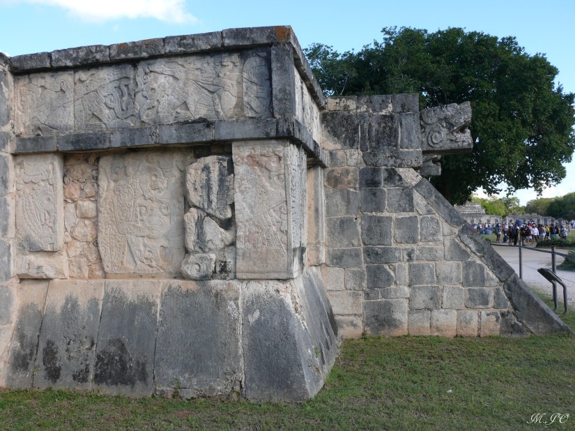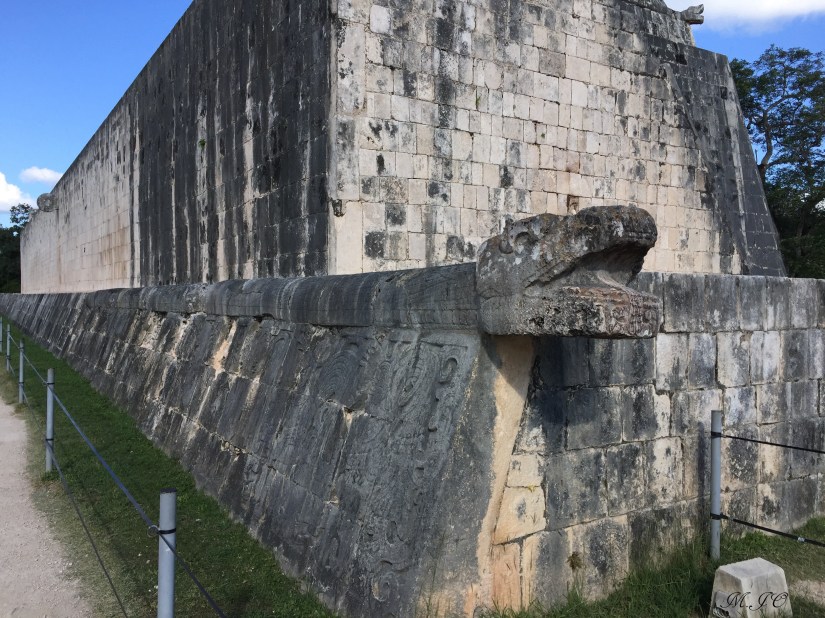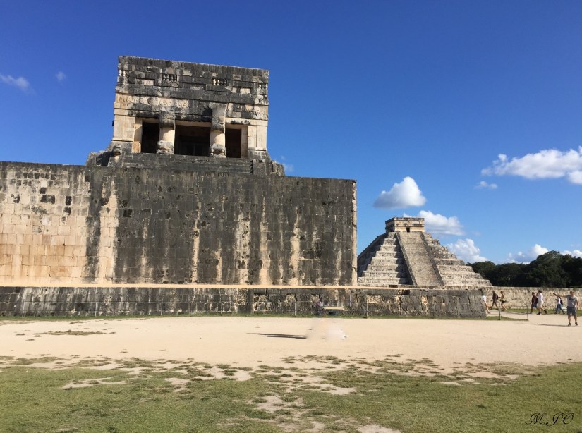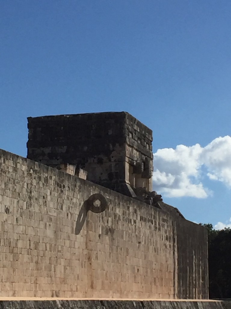 Le terrain de jeu de balle de Chichén Itza est aussi assez impressionnant et il est le plus vaste de toute l’Amérique précolombienne. Le jeu de balle avait une finalité religieuse et probablement sacrificielle. Il fait plus de 160 mètres de long et est composé de deux grandes parois parallèles et complètement verticales par rapport au sol. Il y a deux anneaux de chaque côté très haut et au centre. Les anneaux sont sculptés en forme de serpent à plumes entrelacé. C’est l’emplacement pour marquer les points. Le jeu consistait à utiliser une balle en caoutchouc de 3kg. Deux équipes s’affrontent pour marquer un point dans l’anneau de l’autre équipe. Les joueurs doivent utiliser leur corps mais sans utiliser les mains ni les pieds et sans que la balle ne touche le sol. Le nombre de point à faire était établie avant le début du jeu et la partie n’était terminée que lorsque l’objectif était atteint. Quand on voit la grosseur et la hauteur des anneaux, on peut supposer que ce n’était pas du tout facile.