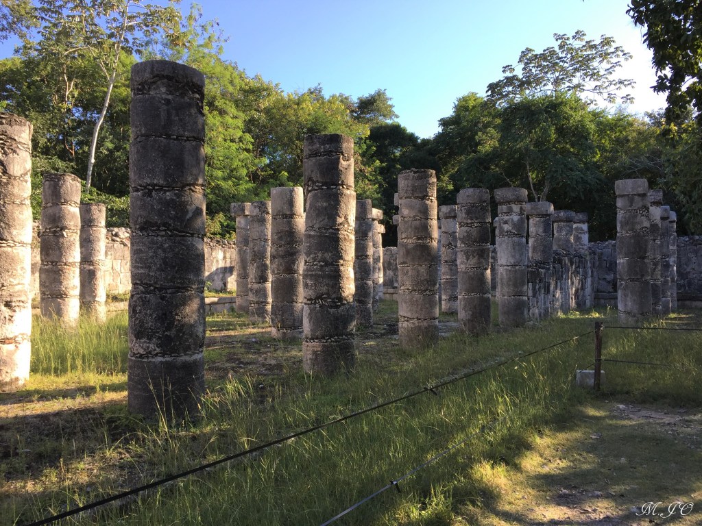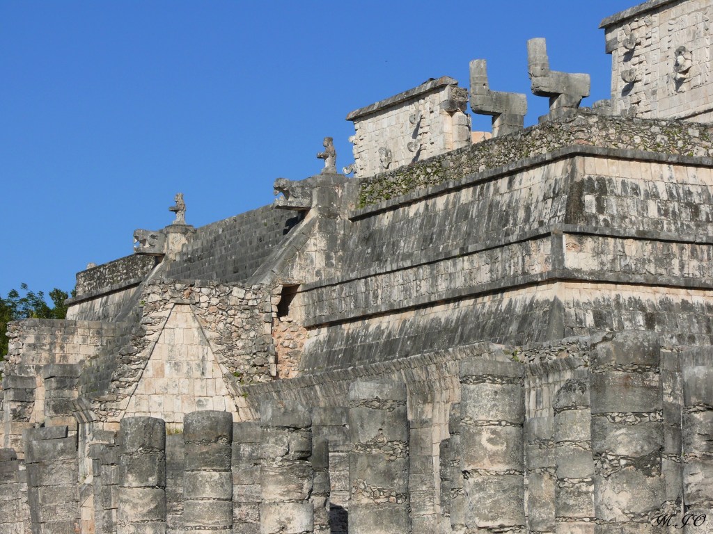 Le temple des guerriers et le groupe des milles colonnes. Ce temple est situé à gauche de la pyramide, tout au fond du site. Le temple des guerriers est constitué de plusieurs plateformes et d’un large escalier en avant. Au sommet, la chambre du temple est précédée d’un portique, dont le toit a disparu, et dont les piliers se terminent en tête de serpent. A l’entrée du portique, se trouve une statue du dieu de la pluie Chac Mool. Les colonnes et les piliers qui sont à droite du temple servaient à supporter les poutres du toit d’une immense galerie qui n’est plus là.