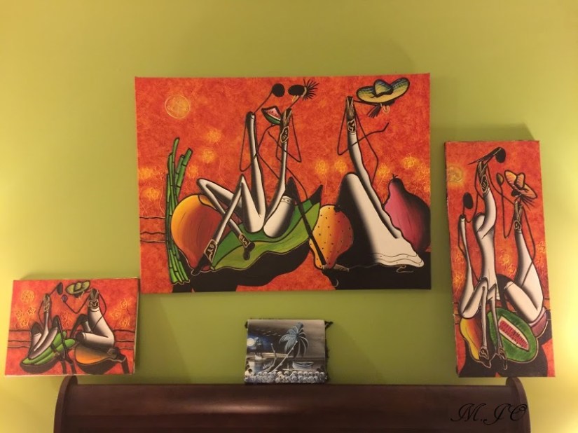 L’histoire des toiles: je n’en reviens pas encore!!! J’avais entendu dire que l’on pouvait négocier avec les vendeurs à Punta cana. Il y a plusieurs marchants qui vendent différents trucs dans des kiosques sur le bord de la mer et il y a beaucoup de toiles d’artiste de là-bas en RD. Je décide donc de magasiner des toiles pour ma nouvelle chambre. Donc, je vois la grosse toile et wow je trippe sur le style de l’artiste, les couleurs, les formes, la texture, les personnages filiformes…. je demande combien elle coûte? Le vendeur me répond en français , car j’ai vraiment un accent horrible en anglais donc il voit que je parle français, bref 500$ le prix de la grosse toile, il me rajoute plusieurs petites toiles qui s’agence avec pour monter le montant genre à 600$, je dit »c’est ben trop cher » , il me demande combien je voulais mettre, je dis pas plus de 50$ pour une toile, il me trouve dure en négociation et me raconte blablabla peins d’histoires, finalement, je choisis ces 3 toiles, lui demande combien , hésite , puis baisse à 400$, à 300$. je lui dis que j’ai pas plus de 50$ que je vais prendre juste une petite toile ou je pars….. finalement j’ai ressorti de la boutique avec les 4 toiles pour 75$…. Je pense que j’ai fait un bon deal!!!